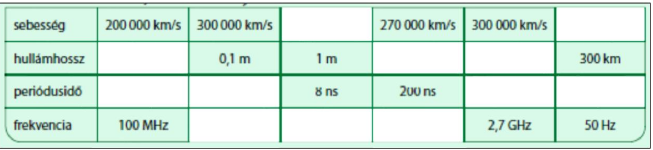 10. Az alábbi táblázatban elektromágneses hullámok sebesség-, hullámhossz-, periódusidő- és frekvenciaadatai találhatók. Másold le a táblázatot, és töltsd ki a hiányzó mezőket!
