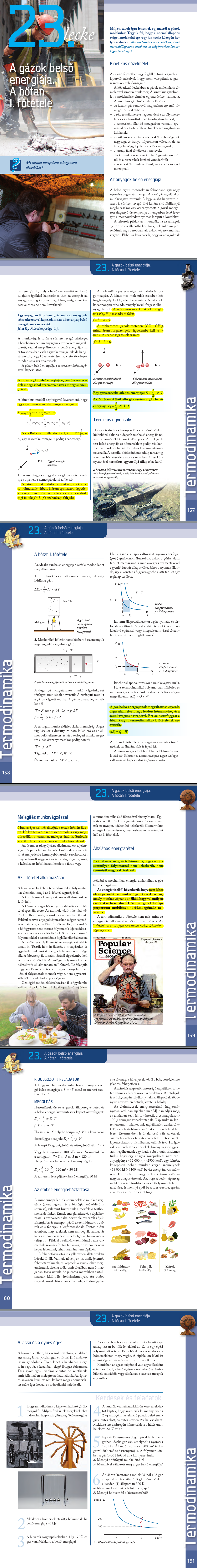 p = 1 Atm = 100 000 N/m2 atmoszferikus nyomáson T = 0 C = 273 K fok hőmérsékleten V = 22 l = 0.022 m3 térfogatot foglal el egy mól mennyiségű gáz ( Avogadro számú gázrészecske, NA = 6*1023 ) fajlagos belső energiája: R = p * V / T = 100 000 N/m2 * 0.022 m3 / 273 K = 2200 Nm /273 K = 8.3 J/K ( ahol R a Regnault féle gázállandó egy mól mennyiségű, Avogadro számú gázrészecskére), és felhasználva a p * V = n * R * T összefüggést n mol mennyiségű gázra, valamint az előző leckében nyert p * V = m * v2 / 3 összefüggést, kapjuk hogy az n mólnyi gáz, avagy N darab ( N = n * NA ) gázrészecske mozgási energiája: Ek = m * v2 / 2 = 3/2 n * R * T = 3/2 N * k * T ahol k = R / NA = 8.3 / (6*1023) J/K = 1.4 *10-23 J/K a Boltzmann konstans, mely megmutatja, hogy egy gázrészecske mozgási energiája Ek1 = m1 * v2 / 2 = 3/2 k * T, ahol m1 = m / N . Általánosítva a fenti egyatomos részecskékre kidolgozott képletet a két- és háromatomos részecskéket is tartalmazó gázokra: Ek1 = f/2 k * T, vagy N részecskéből álló gáz esetén Ek = f/2 N * k * T, ahol f a szabadsági fokok száma, f = 3 az egyatomos három irányban mozgó részecskék esetén, f = 5 a kétatomos három irányban mozgó és két tengely körül forgó részecskék esetén, valamint f = 6 a háromatomos három irányban mozgó és három tengely körül forgó részecskék esetén. Magyarázat: -száz részecskéből csak egy részecske rendelkezzen mozgási energiával, a többi nyugodjon: az ütközések következtében rövid időn belül ez az energia egyenletesen eloszlik (! - ekvipartició elve - !) az összes részecske között. - a száz részecske mozogjon csak az x irányban, az y és z irányokban legyen nyugvás: az ütközések következtében rövid időn belül ez az energia egyenletesen eloszlik az x, y és z irányokba is (! - ekvipartició elve - !), ezért f = 3 . - a száz kétatomos részecske mozogjon csak az x, y és z irányokban, de az y és z forgástengelyek körül legyen nyugvás: az ütközések következtében rövid időn belül ez az energia egyenletesen eloszlik az x, y és z irányokba való mozgás és y és z forgástengelyek körüli pörgésre is (! - ekvipartició elve - !), ezért f = 5 . - a száz háromatomos részecske mozogjon csak az x, y és z irányokban, de az x, y és z forgástengelyek körül legyen nyugvás: az ütközések következtében rövid időn belül ez az energia egyenletesen eloszlik az x, y és z irányokba való mozgás és x, y és z forgástengelyek körüli pörgésre is (! - ekvipartició elve - !), ezért f = 6 . A hőtan I. főtétele kimondja, hogy a gáz belső energiájának változása egyenlő a gáz által leadott vagy felvett munka és hőenergia összegével: ΔEb = W + Q , ahol a belső energia valóban a gázt alkotó részecskék mozgási energiájából ered, melyet a Kelvin fokban mért abszolút hőmérséklettel jellemezünk: ΔEb = ΔEk = f/2 N * k * ΔT . Így például nyomjuk össze a V térfogatú gázt térfogata felére: az összenyomásához F erőt kell kifejtenünk, és mivel s szakasszal nyomtuk összébb, a gázon végzett munka: W = F * s . Mivel ezzel energiát adtunk a gáznak, ezt a részecskéknek át kell venniük, mozgásuk gyorsabb lesz, ezzel a gáz hőmérséklete lesz nagyobb (adiabatikus folyamat). Amennyiben azonban megengedjük, hogy a gáz a többlet energiát leadja a környezetének, olyannyira, hogy a hőmérséklete semennyit sem változzon (izoterm folyamat), akkor csak a nyomás fog megduplázódnia a felére zsugorodott térfogat miatt ( p * V = const., Boyl-Mariott törvény) . A gáz állandó nyomáson való tartásával (izobár folyamat), például lufi melegedése a tűző napon a Kelvinben mért hőmérsékletnövekménnyel arányos térfogatnövekményt fog eredményezni ( V / T = const., Gay-Lussac első törvénye) . A gáz állandó térfogaton való tartásával (izochor folyamat), például kukta melegedése a tűzhelyen a Kelvinben mért hőmérsékletnövekménnyel arányos nyomásnövekményt fog eredményezni ( p / T = const., Gay-Lussac második törvénye) .